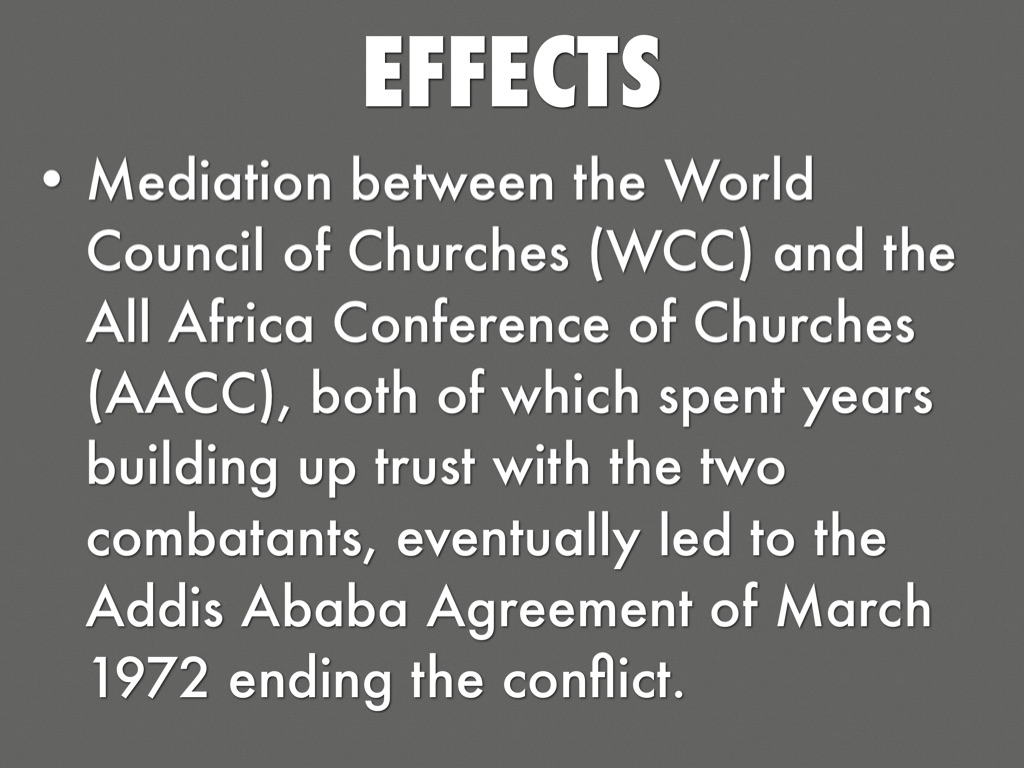 - Mediation between the World Council of Churches (WCC) and the All Africa Conference of Churches (AACC), both of which spent years building up trust with the two combatants, eventually led to the Addis Ababa Agreement of March 1972 ending the conflict.
