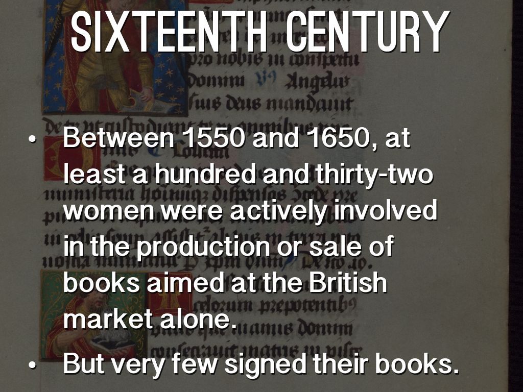 • Between 1550 and 1650, at least a hundred and thirty-two women were actively involved in the production or sale of books aimed at the British market alone.