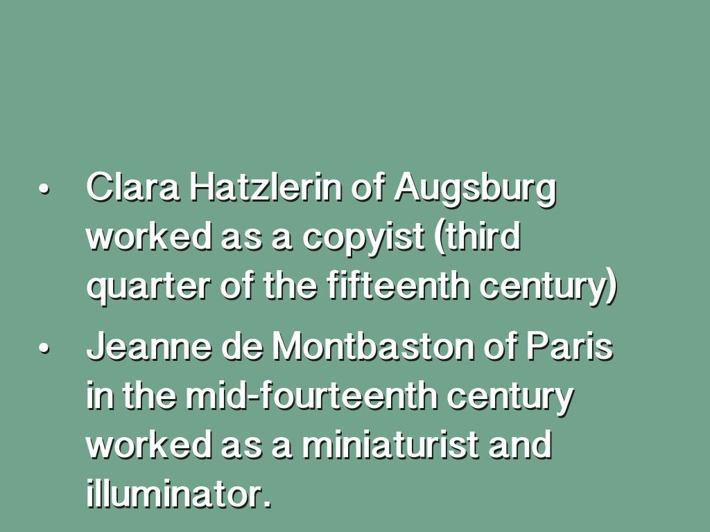 • Jeanne de Montbaston of Paris in the mid-fourteenth century worked as a miniaturist and illuminator.