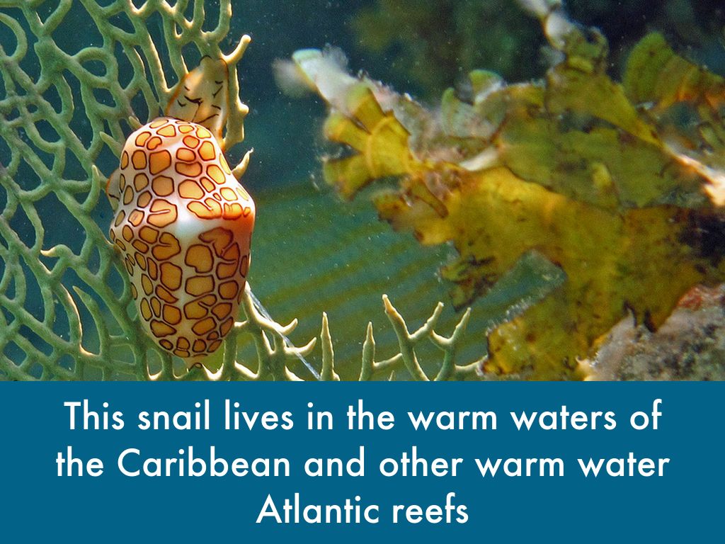 This snail lives in the warm waters of the Caribbean and other warm water Atlantic reefs