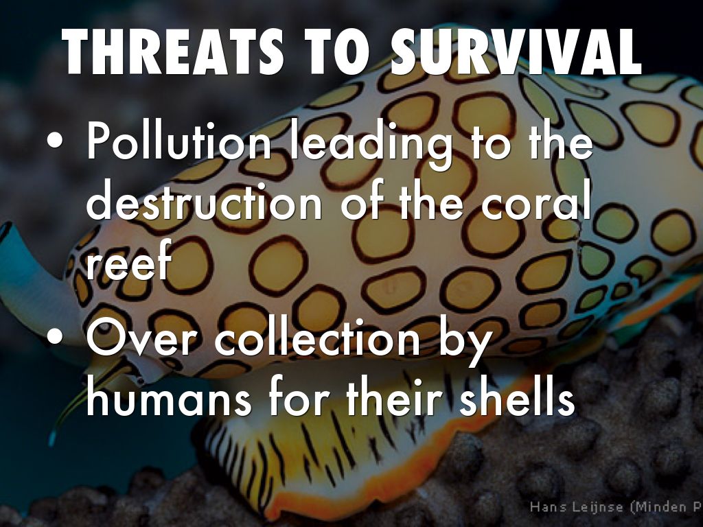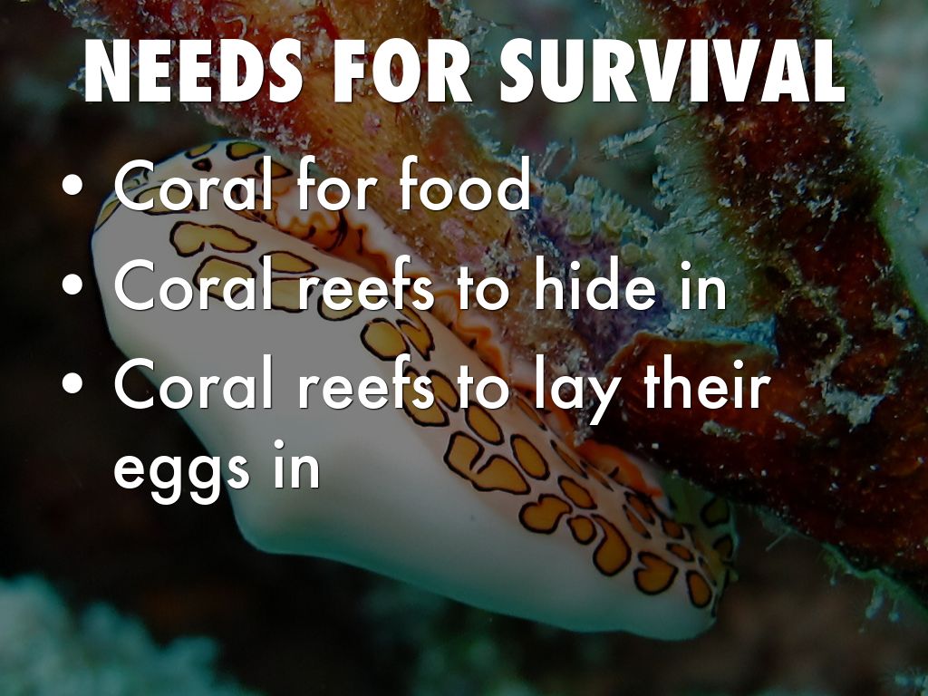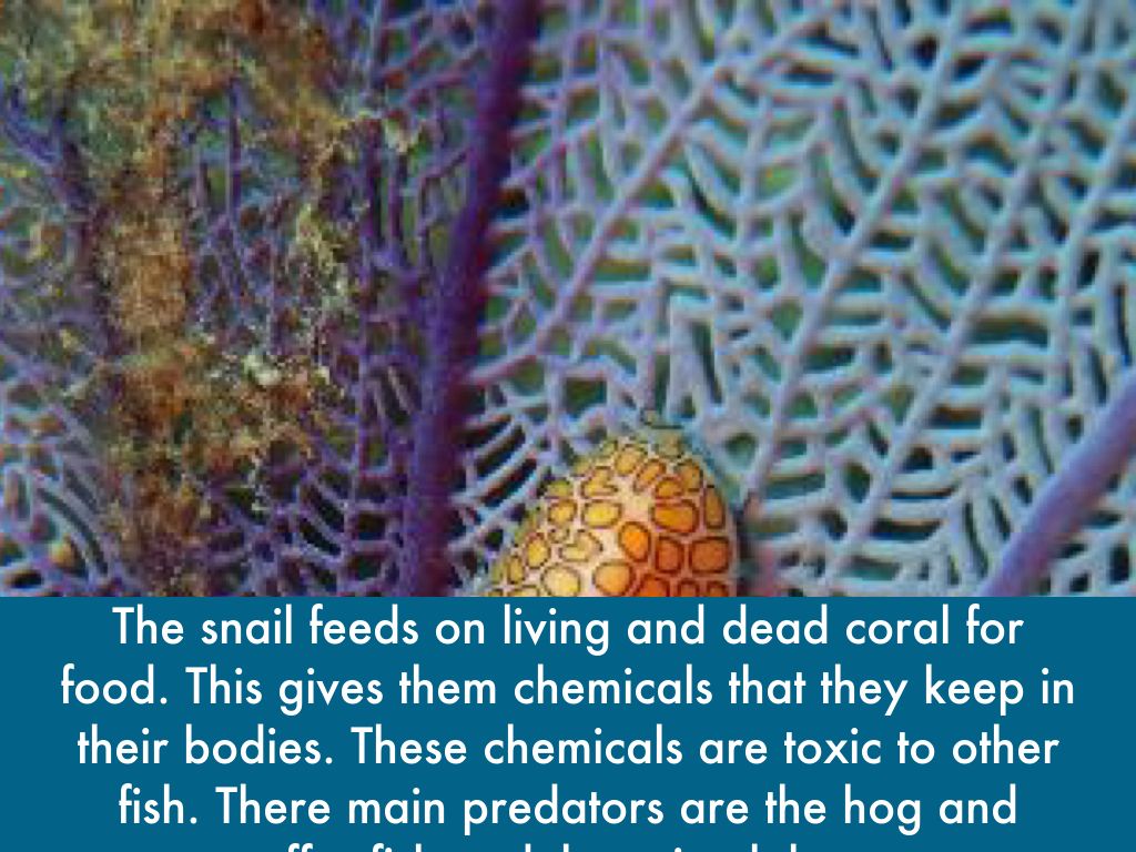 The snail feeds on living and dead coral for food. This gives them chemicals that they keep in their bodies. These chemicals are toxic to other fish. There main predators are the hog and puffer fish and the spiny lobster.