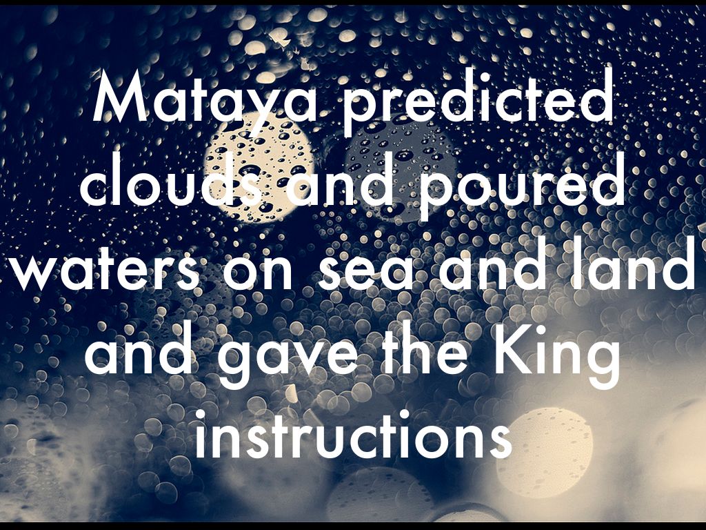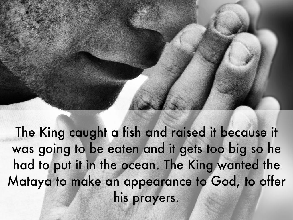 The King caught a fish and raised it because it was going to be eaten and it gets too big so he had to put it in the ocean. The King wanted the Mataya to make an appearance to God, to offer his prayers.