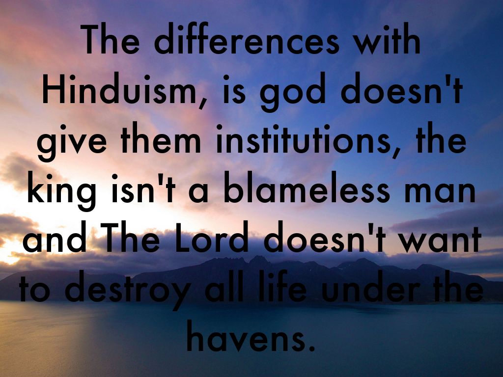 The differences with Hinduism, is god doesn't give them institutions, the king isn't a blameless man and The Lord doesn't want to destroy all life under the havens.