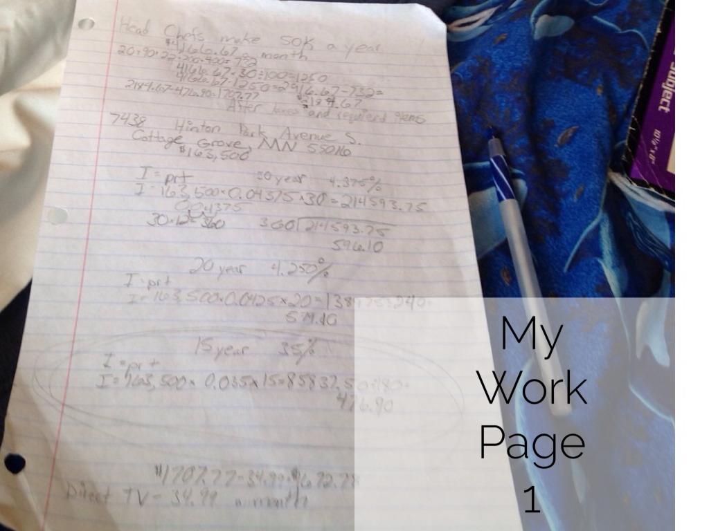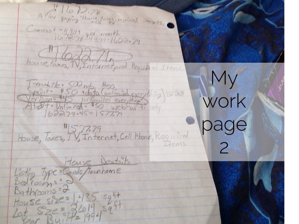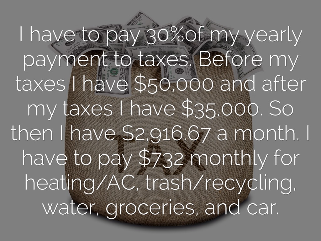 I have to pay 30%of my yearly payment to taxes. Before my taxes I have $50,000 and after my taxes I have $35,000. So then I have $2,916.67 a month. I have to pay $732 monthly for heating/AC, trash/recycling, water, groceries, and car.