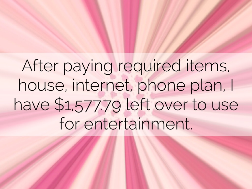 After paying required items, house, internet, phone plan, I have $1,577.79 left over to use for entertainment.