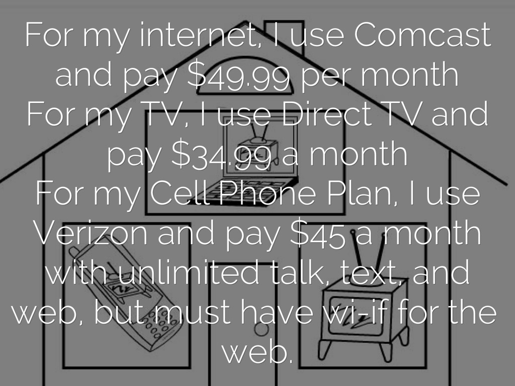 For my Cell Phone Plan, I use Verizon and pay $45 a month with unlimited talk, text, and web, but must have wi-if for the web.