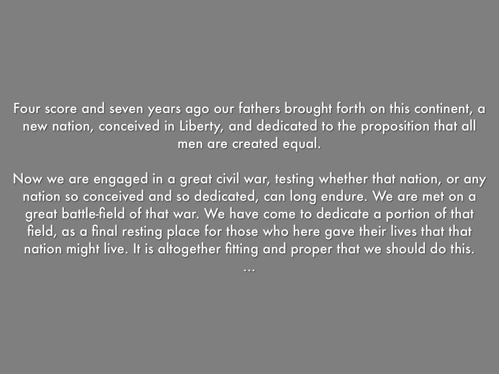 Four score and seven years ago our fathers brought forth on this continent, a new nation, conceived in Liberty, and dedicated to the proposition that all men are created equal.