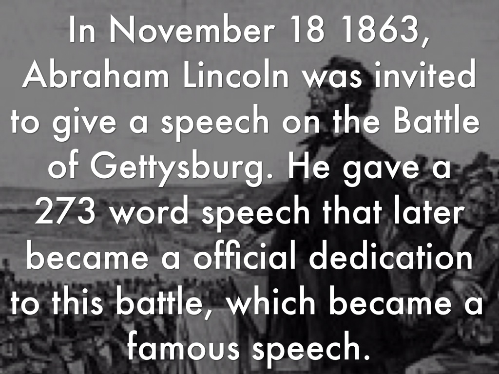 In November 18 1863, Abraham Lincoln was invited to give a speech on the Battle of Gettysburg. He gave a 273 word speech that later became a official dedication to this battle, which became a famous speech.