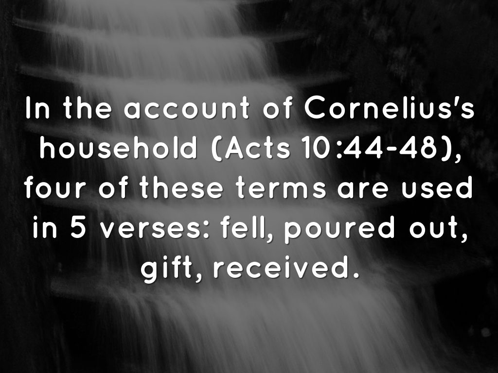 In the account of Cornelius's household (Acts 10:44-48), four of these terms are used in 5 verses: fell, poured out, gift, received.