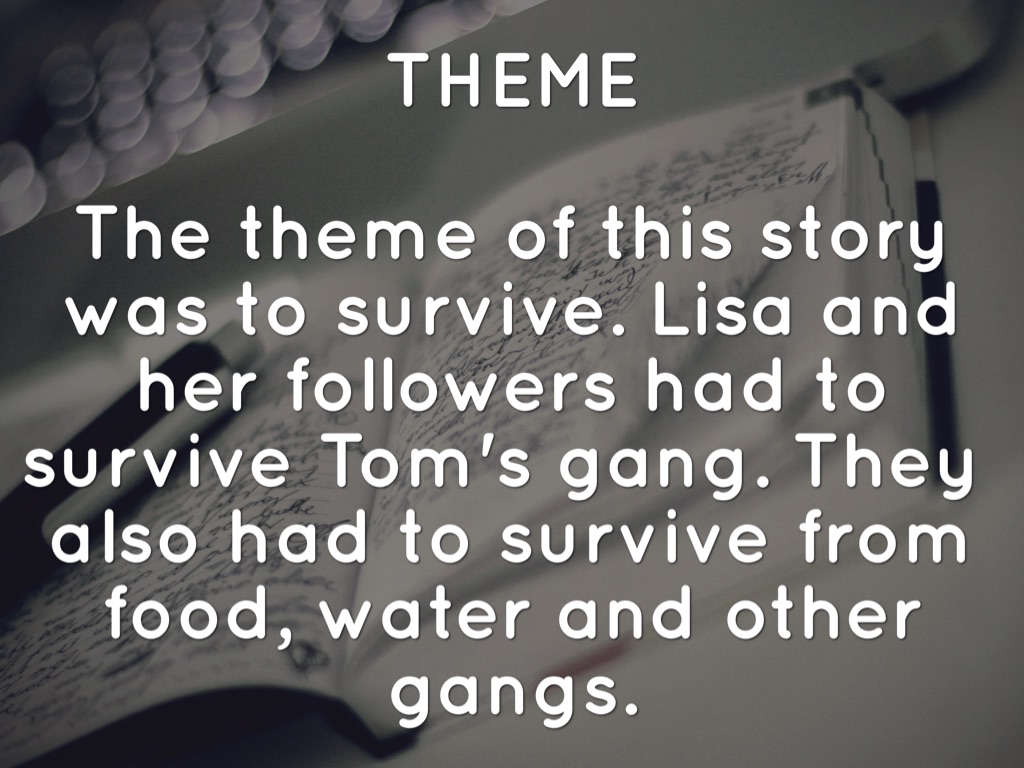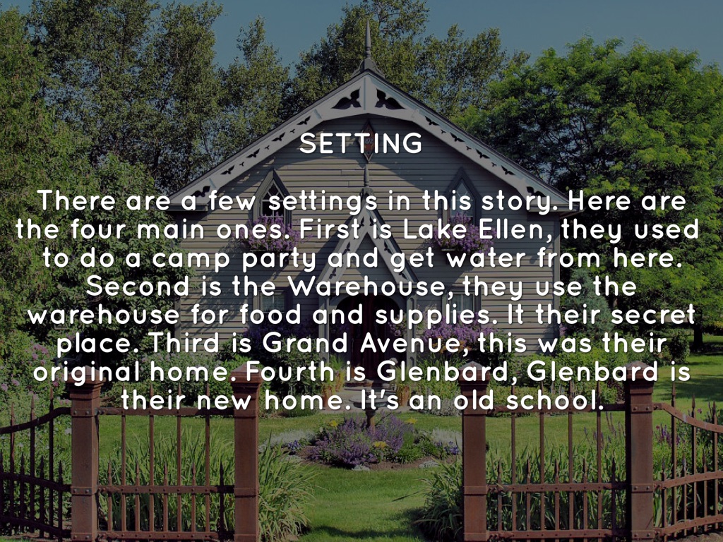 There are a few settings in this story. Here are the four main ones. First is Lake Ellen, they used to do a camp party and get water from here. Second is the Warehouse, they use the warehouse for food and supplies. It their secret place. Third is Grand Avenue, this was their original home. Fourth is Glenbard, Glenbard is their new home. It's an old school.