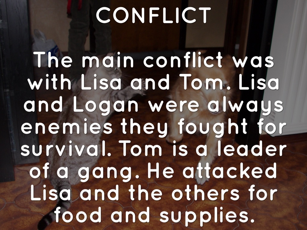 The main conflict was with Lisa and Tom. Lisa and Logan were always enemies they fought for survival. Tom is a leader of a gang. He attacked Lisa and the others for food and supplies.