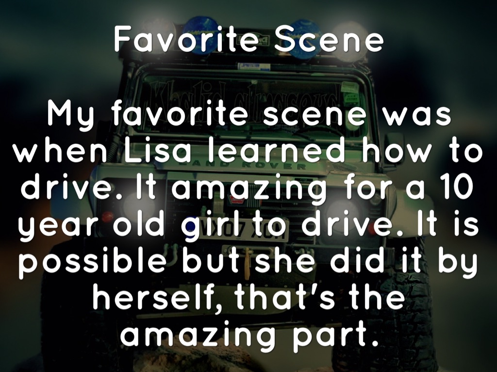 My favorite scene was when Lisa learned how to drive. It amazing for a 10 year old girl to drive. It is possible but she did it by herself, that's the amazing part.