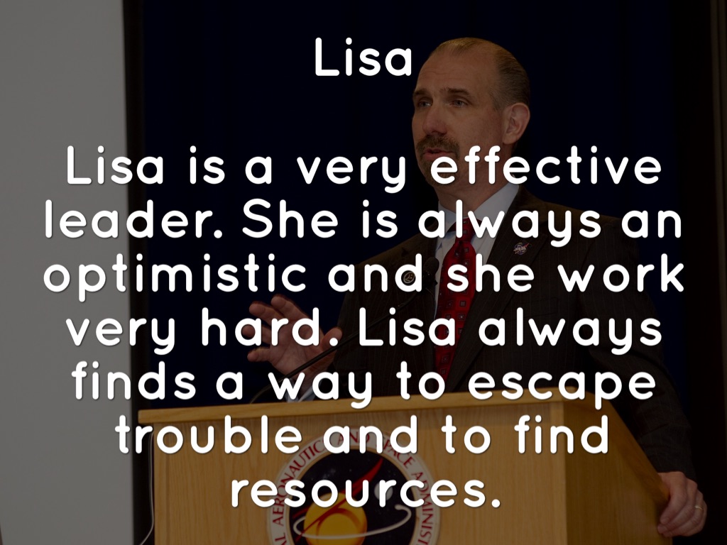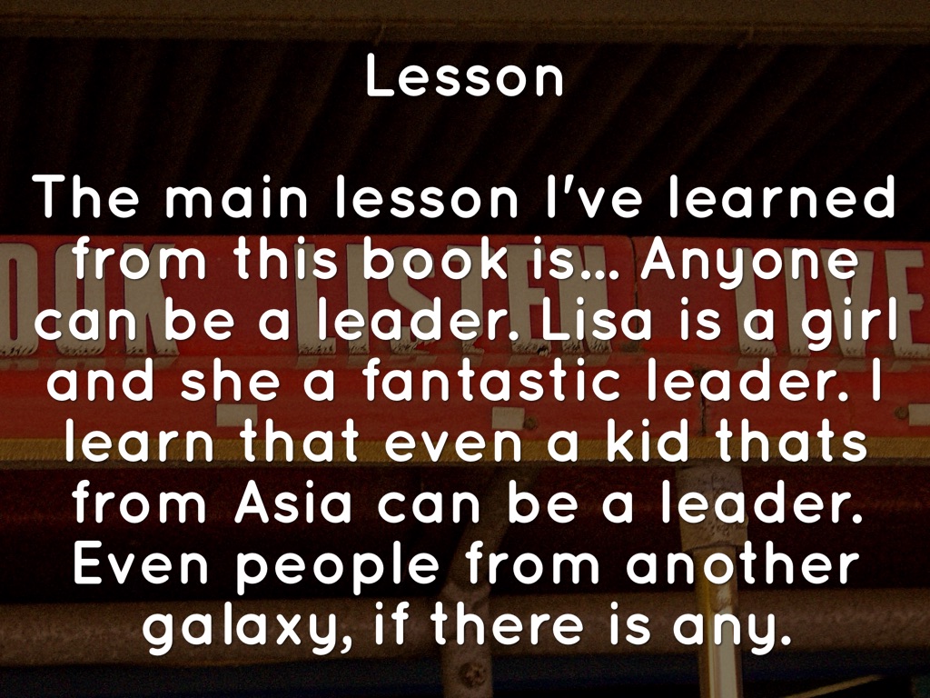 The main lesson I've learned from this book is... Anyone can be a leader. Lisa is a girl and she a fantastic leader. I learn that even a kid thats from Asia can be a leader. Even people from another galaxy, if there is any.