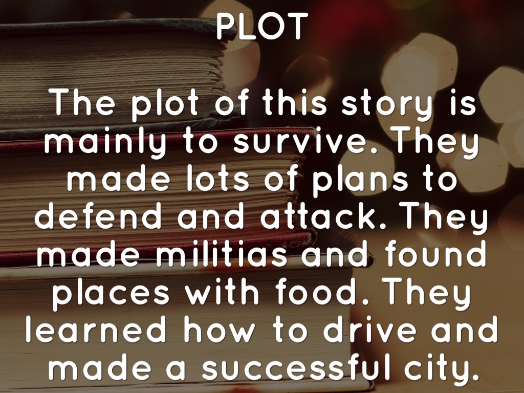 The plot of this story is mainly to survive. They made lots of plans to defend and attack. They made militias and found places with food. They learned how to drive and made a successful city.