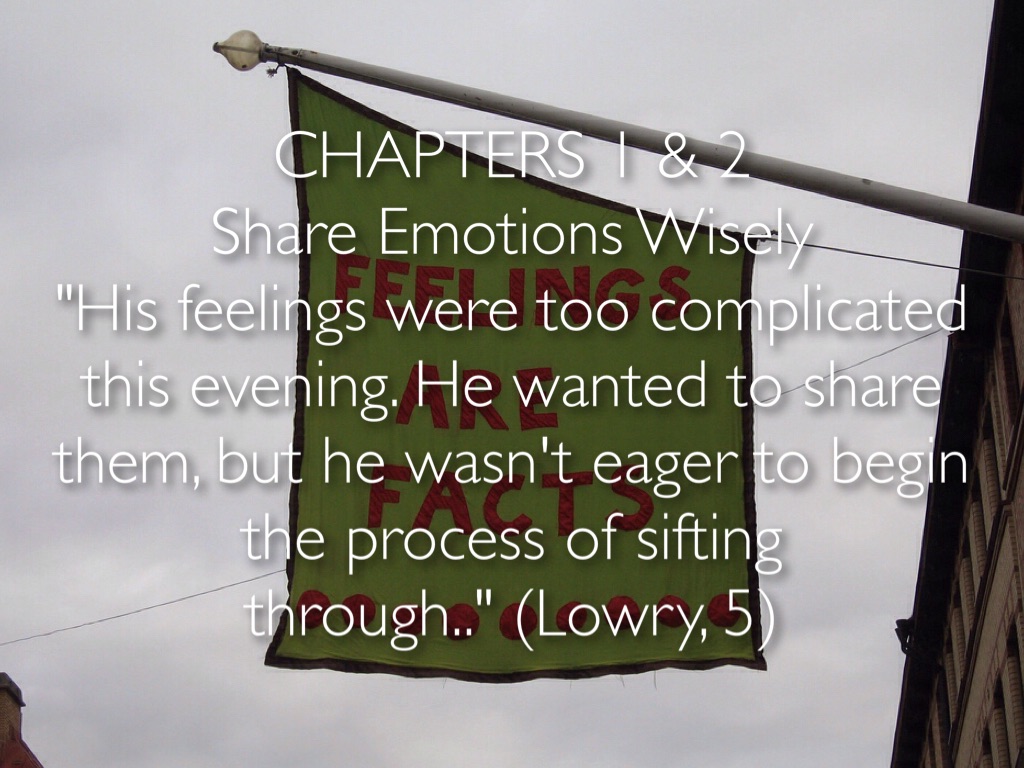 CHAPTERS 1 & 2 Share Emotions Wisely "His feelings were too complicated this evening. He wanted to share them, but he wasn't eager to begin the process of sifting through.." (Lowry, 5)