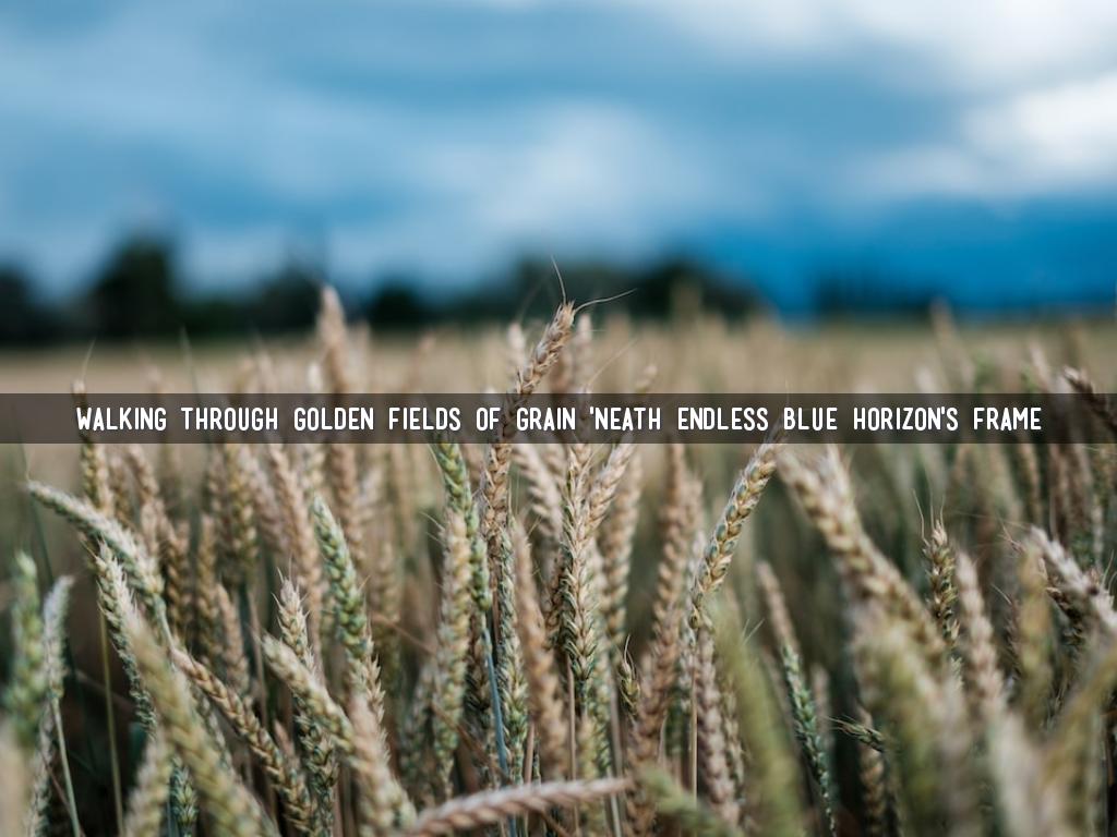 Walking through golden fields of grain 'Neath endless blue horizon's frame