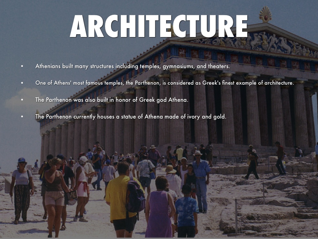 Athenians built many structures including temples, gymnasiums, and theaters. One of the most famous temples is called the Parthenon. The Parthenon was built on a high hill called the Acropolis and is considered as the finest example of Greek architecture. The Parthenon was built in honor of the Greek god Athena and also housed a statue of Athena made of ivory and gold.