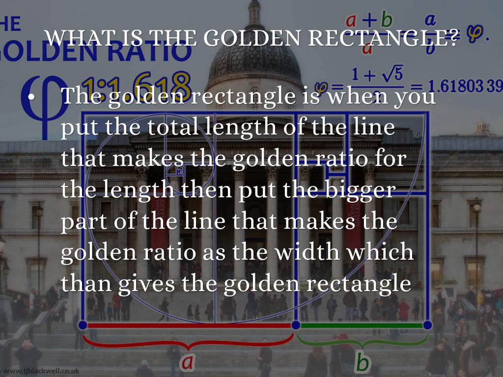 • The golden rectangle is when you put the total length of the line that makes the golden ratio for the length then put the bigger part of the line that makes the golden ratio as the width which than gives the golden rectangle