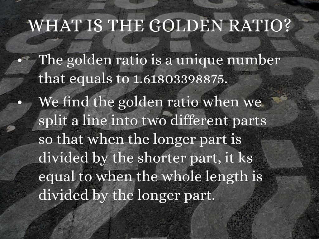 • We find the golden ratio when we split a line into two different parts so that when the longer part is divided by the shorter part, it ks equal to when the whole length is divided by the longer part.