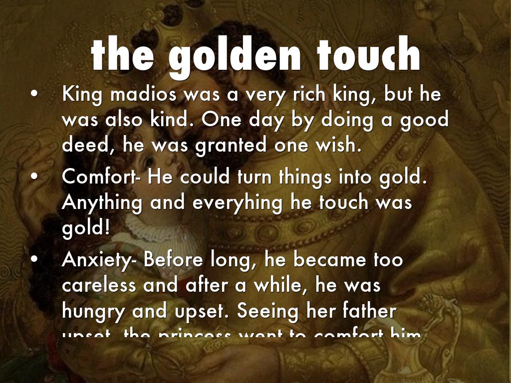 Anxiety- Before long, he became too careless and after a while, he was hungry and upset. Seeing her father upset, the princess went to comfort him, only to get turned into gold herself.