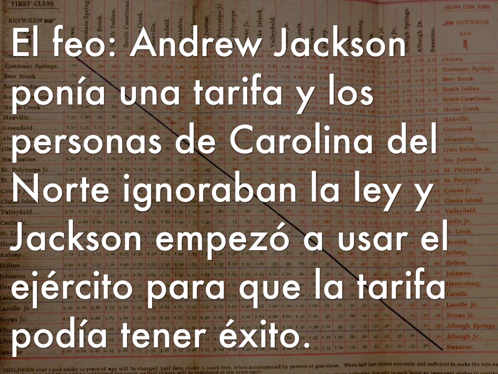 El feo: Andrew Jackson ponía una tarifa y los personas de Carolina del Norte ignoraban la ley y Jackson empezó a usar el ejército para que la tarifa podía tener éxito.
