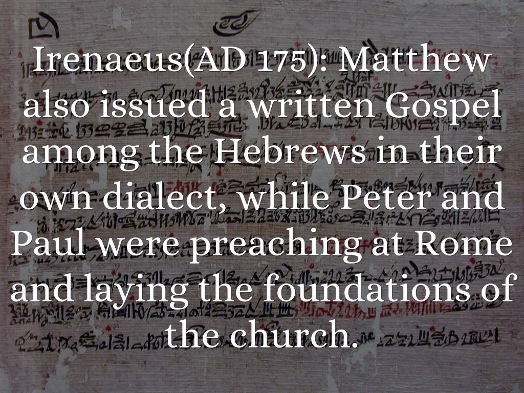 Irenaeus(AD 175): Matthew also issued a written Gospel among the Hebrews in their own dialect, while Peter and Paul were preaching at Rome and laying the foundations of the church.