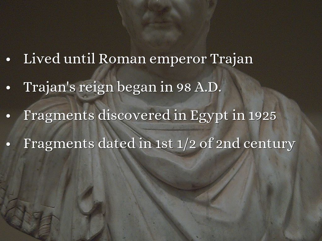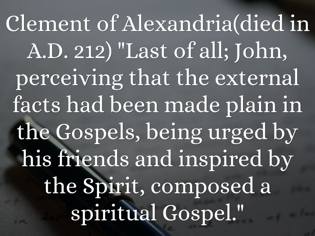 Clement of Alexandria(died in A.D. 212) "Last of all; John, perceiving that the external facts had been made plain in the Gospels, being urged by his friends and inspired by the Spirit, composed a spiritual Gospel."