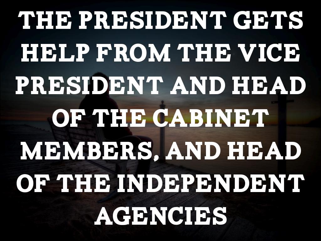 The president gets help from the Vice President and head of the cabinet members, and head of the independent agencies