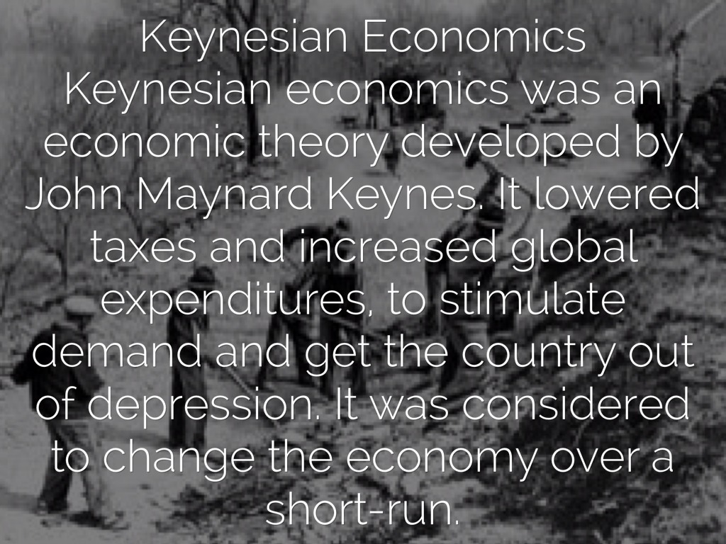 Keynesian economics was an economic theory developed by John Maynard Keynes. It lowered taxes and increased global expenditures, to stimulate demand and get the country out of depression. It was considered to change the economy over a short-run.