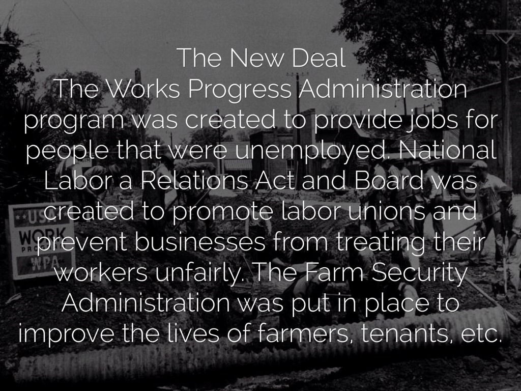 The Works Progress Administration program was created to provide jobs for people that were unemployed. National Labor a Relations Act and Board was created to promote labor unions and prevent businesses from treating their workers unfairly. The Farm Security Administration was put in place to improve the lives of farmers, tenants, etc.