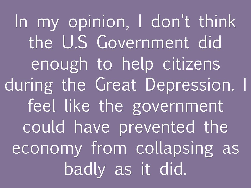 In my opinion, I don't think the U.S Government did enough to help citizens during the Great Depression. I feel like the government could have prevented the economy from collapsing as badly as it did.