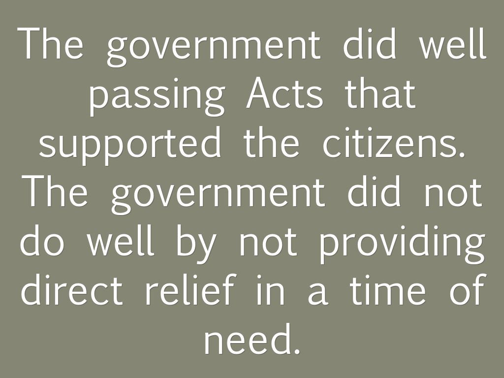 The government did well passing Acts that supported the citizens. The government did not do well by not providing direct relief in a time of need.