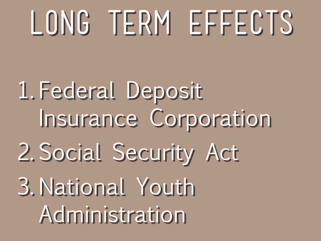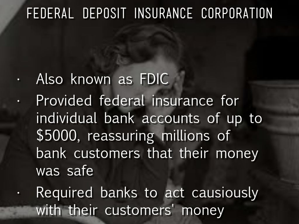 • Provided federal insurance for individual bank accounts of up to $5000, reassuring millions of bank customers that their money was safe