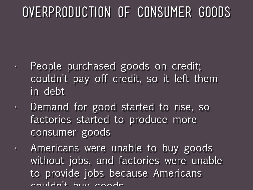 • Americans were unable to buy goods without jobs, and factories were unable to provide jobs because Americans couldn't buy goods