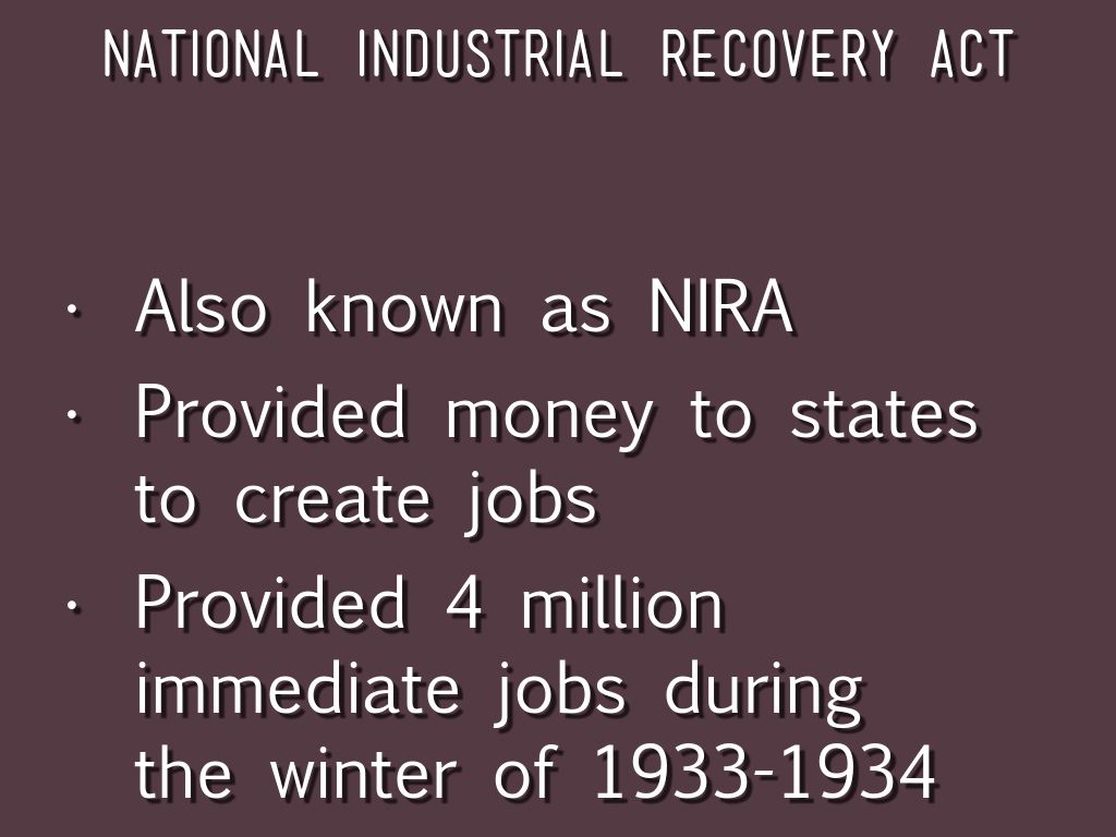 • Provided 4 million immediate jobs during the winter of 1933-1934