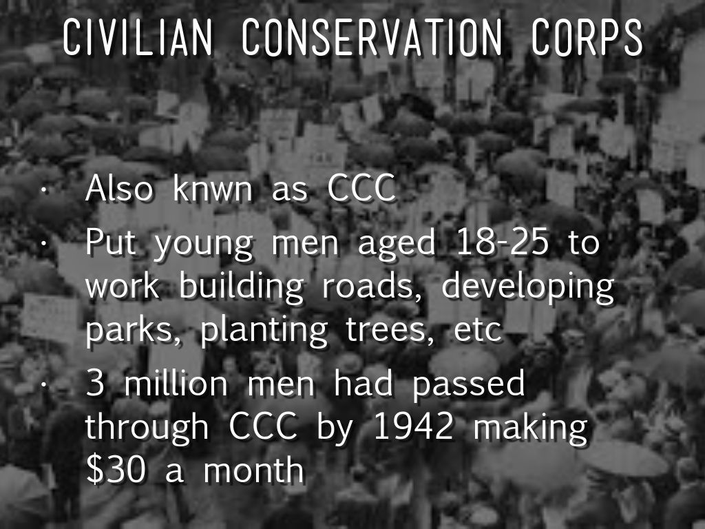 • 3 million men had passed through CCC by 1942 making $30 a month