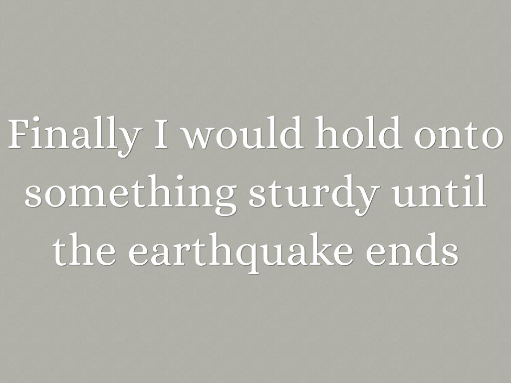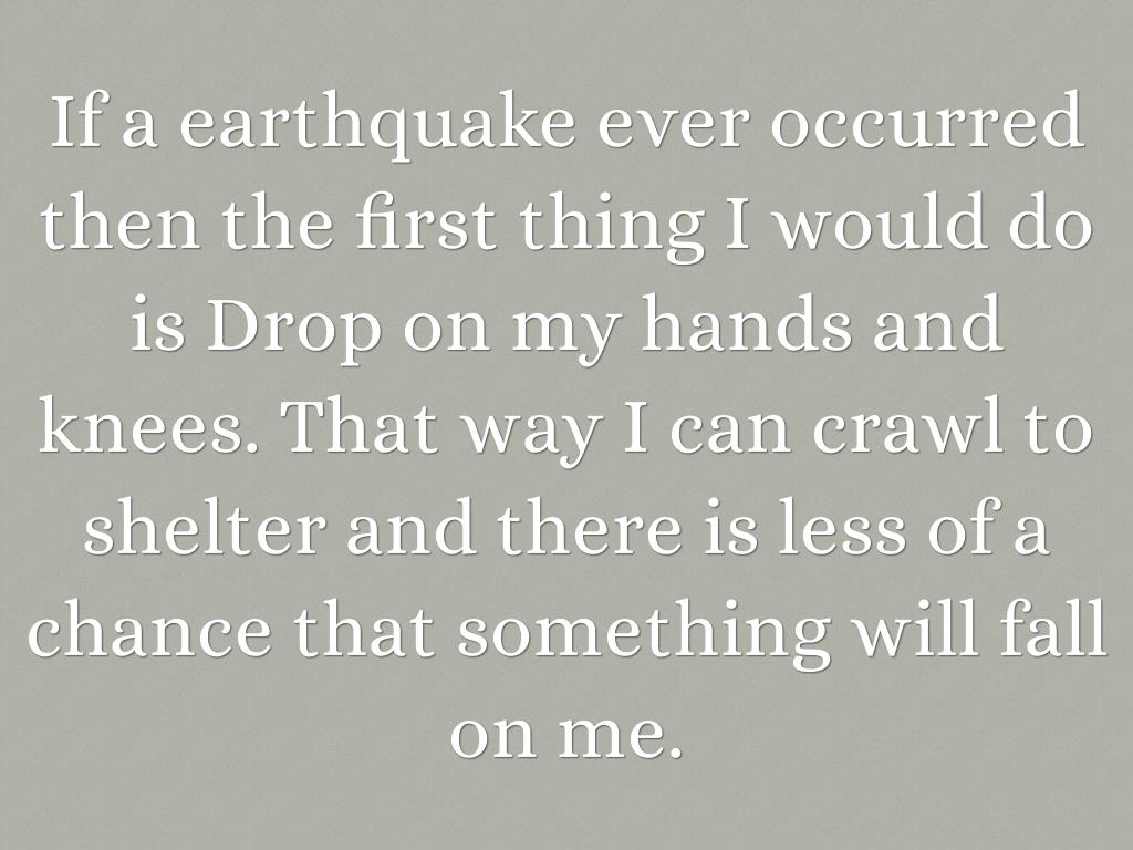 If a earthquake ever occurred then the first thing I would do is Drop on my hands and knees. That way I can crawl to shelter and there is less of a chance that something will fall on me.