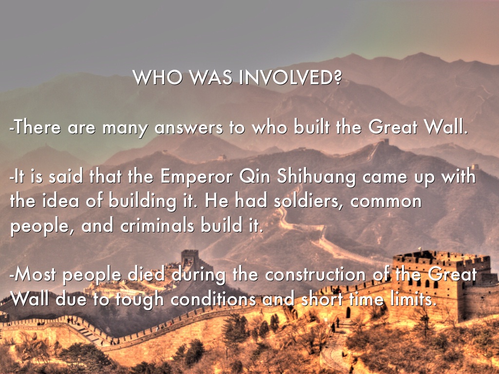 -It is said that the Emperor Qin Shihuang came up with the idea of building it. He had soldiers, common people, and criminals build it.