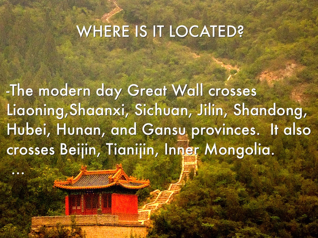 -The modern day Great Wall crosses Liaoning,Shaanxi, Sichuan, Jilin, Shandong, Hubei, Hunan, and Gansu provinces. It also crosses Beijin, Tianijin, Inner Mongolia.