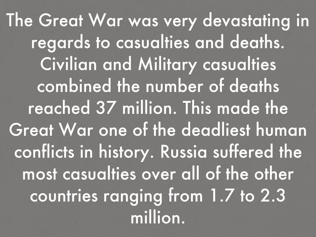 The Great War was very devastating in regards to casualties and deaths. Civilian and Military casualties combined the number of deaths reached 37 million. This made the Great War one of the deadliest human conflicts in history. Russia suffered the most casualties over all of the other countries ranging from 1.7 to 2.3 million.