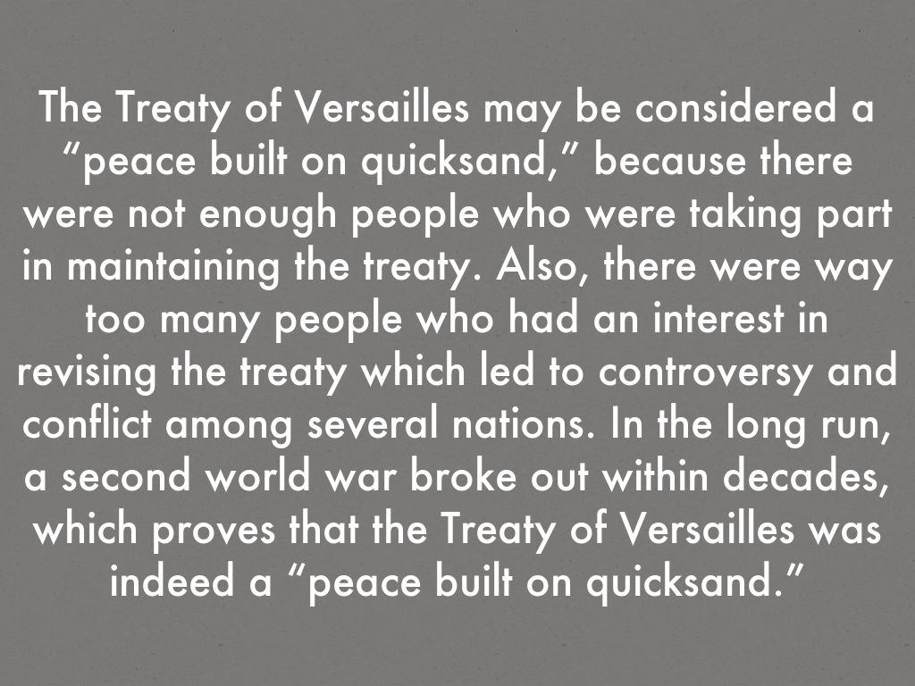 The Treaty of Versailles may be considered a “peace built on quicksand,” because there were not enough people who were taking part in maintaining the treaty. Also, there were way too many people who had an interest in revising the treaty which led to controversy and conflict among several nations. In the long run, a second world war broke out within decades, which proves that the Treaty of Versailles was indeed a “peace built on quicksand.”