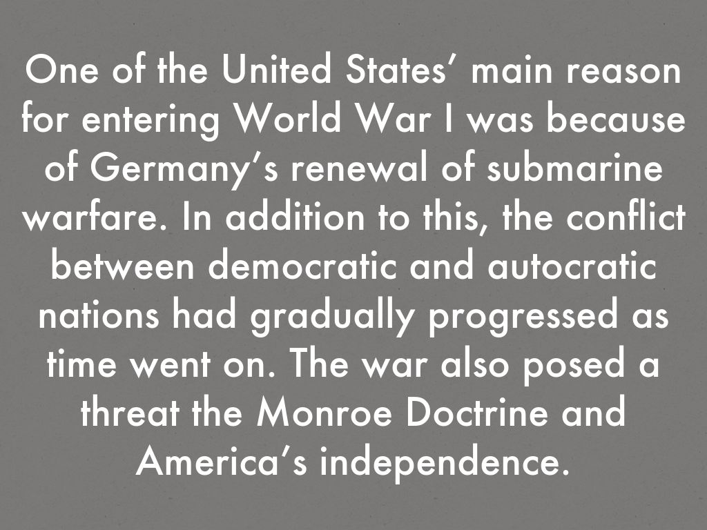 One of the United States’ main reason for entering World War I was because of Germany’s renewal of submarine warfare. In addition to this, the conflict between democratic and autocratic nations had gradually progressed as time went on. The war also posed a threat the Monroe Doctrine and America’s independence.