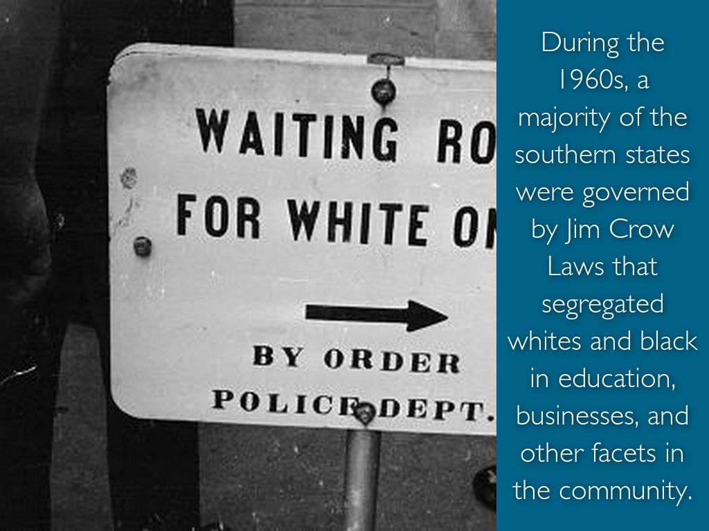 During the 1960s, a majority of the southern states were governed by Jim Crow Laws that segregated whites and black in education, businesses, and other facets in the community.