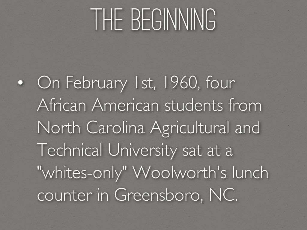 - On February 1st, 1960, four African American students from North Carolina Agricultural and Technical University sat at a "whites-only" Woolworth's lunch counter in Greensboro, NC.