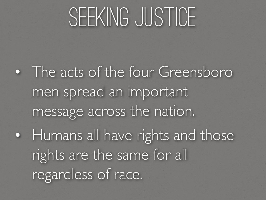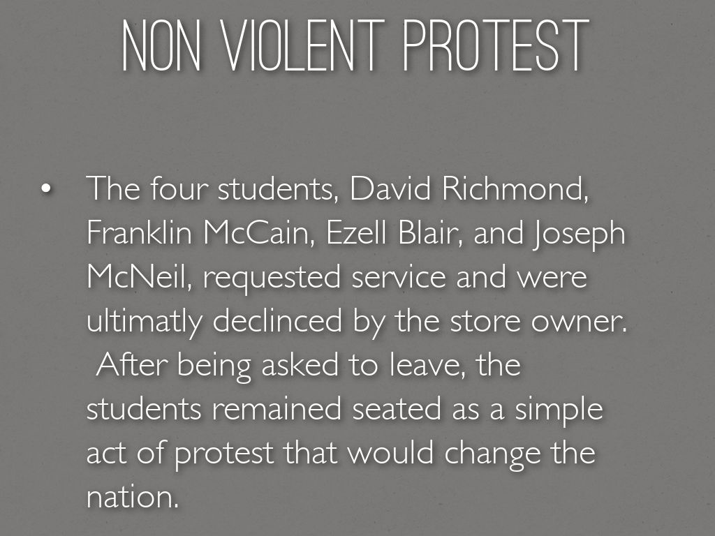 - The four students, David Richmond, Franklin McCain, Ezell Blair, and Joseph McNeil, requested service and were ultimatly declinced by the store owner. After being asked to leave, the students remained seated as a simple act of protest that would change the nation.