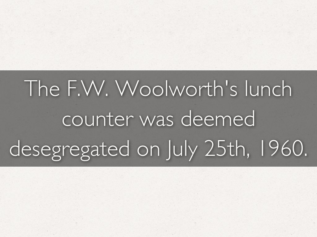 The F.W. Woolworth's lunch counter was deemed desegregated on July 25th, 1960.