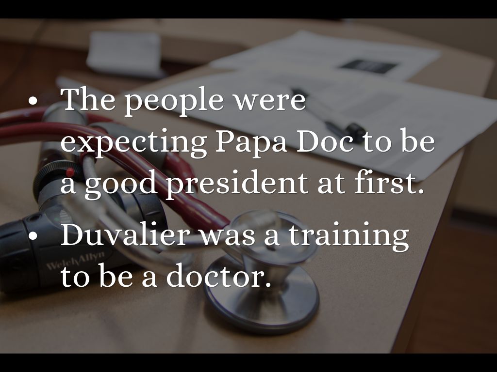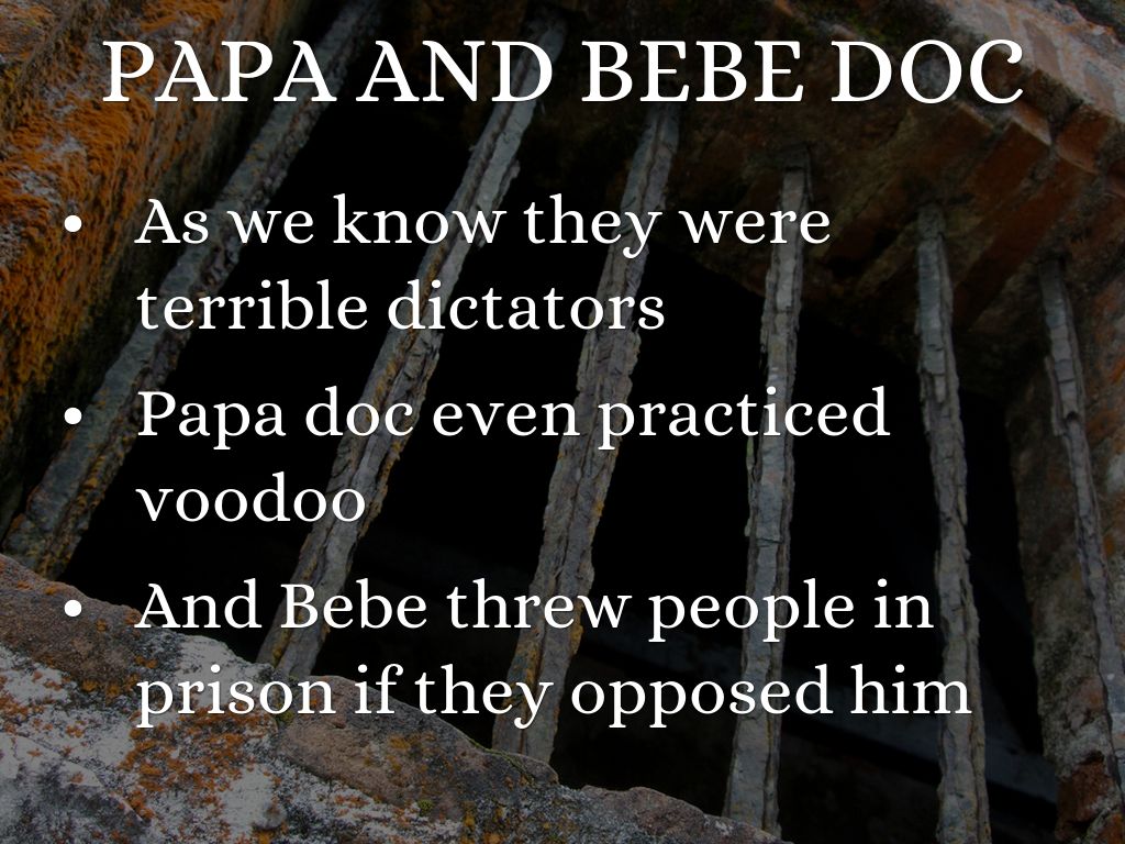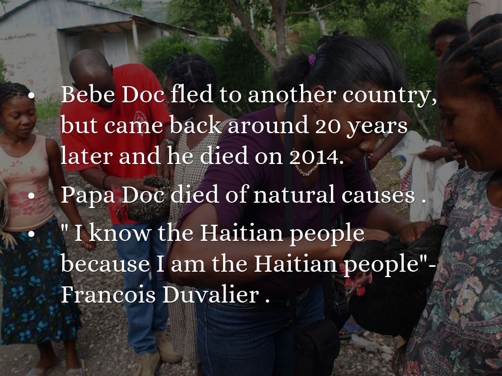 After Papa Docs rule, his succeeder Bebe Doc ( Papa doc's son) was ruling Haiti.