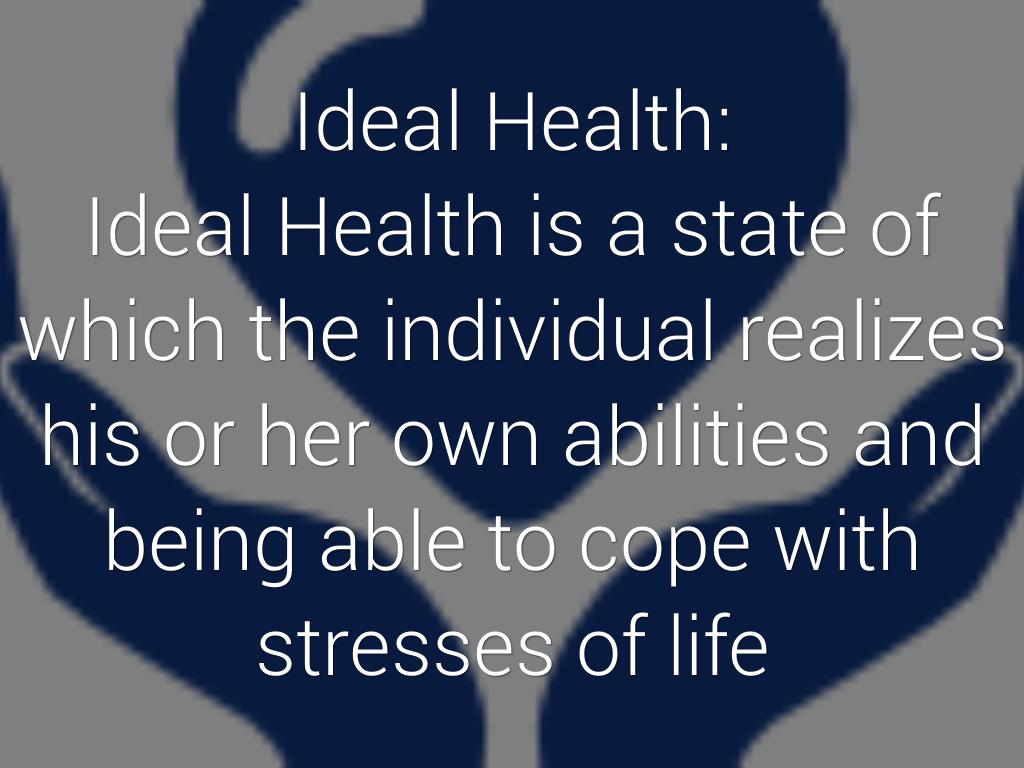 Ideal Health is a state of which the individual realizes his or her own abilities and being able to cope with stresses of life
