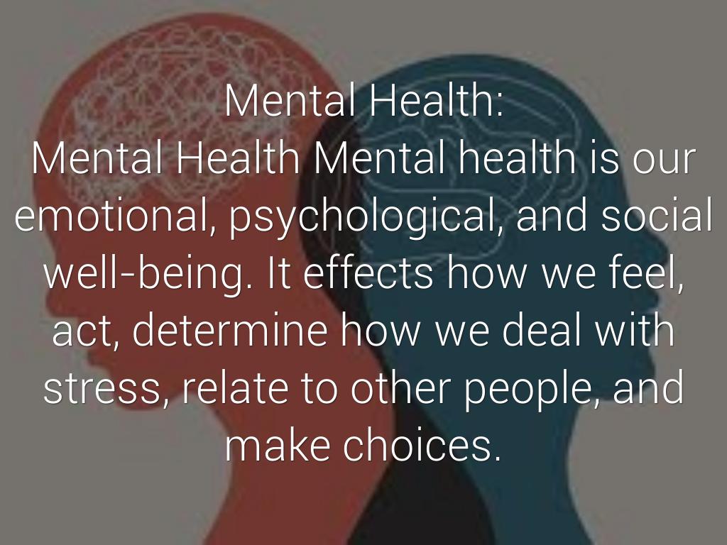 Mental Health Mental health is our emotional, psychological, and social well-being. It effects how we feel, act, determine how we deal with stress, relate to other people, and make choices.