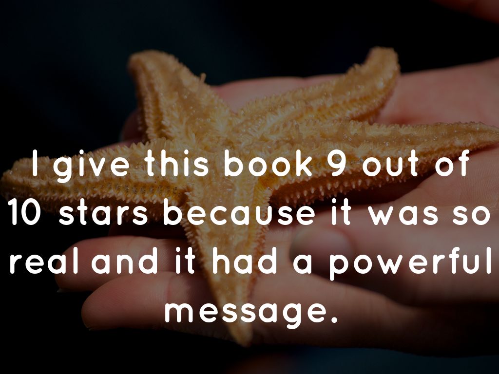 I give this book 9 out of 10 stars because it was so real and it had a powerful message.